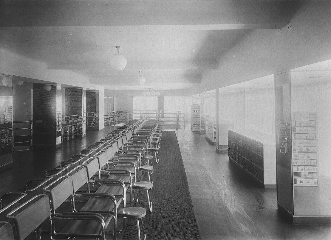 Усередині магазину було багато стільців та табуретів виготовлених з трубчастої сталі. Меблі з цього матеріалу на той момент тільки з’явилися і вважалися ультрасучасними, естетичними. Вони не збирали бруд, пил і легко чистилися. Підлога, сходові проступи в “Der Hermes-Schuhpalast” були оформлені синім і сірим лінолеумом. Поєднання кольорового лінолеуму з міцною металевою окантовкою було ідеальним.